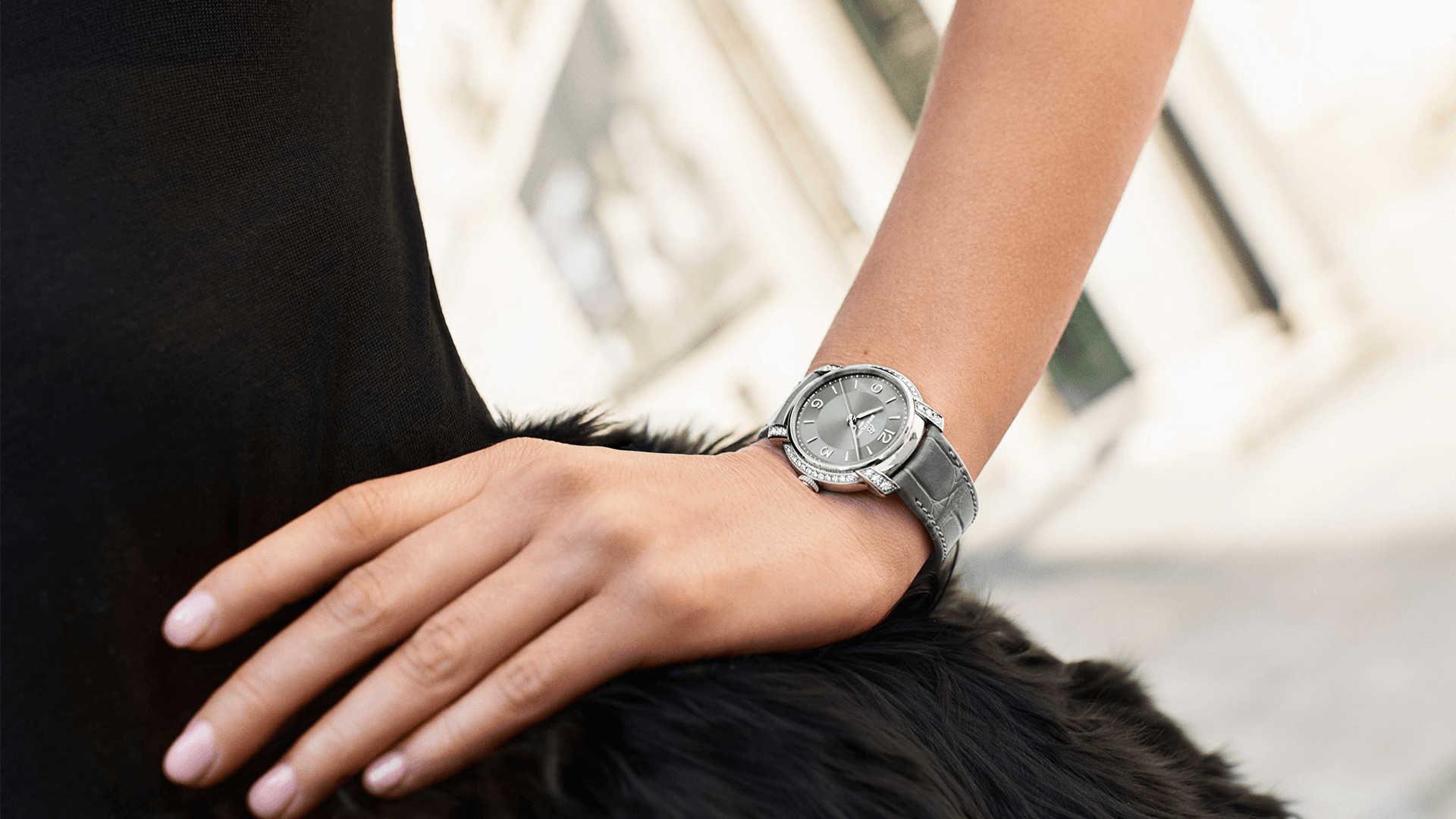 Neutrale klasse in een grijstint die bij elke gelegenheid past. De diamantdetails en verfijnde wijzerplaatafwerking maken dit model een tijdloze keuze.